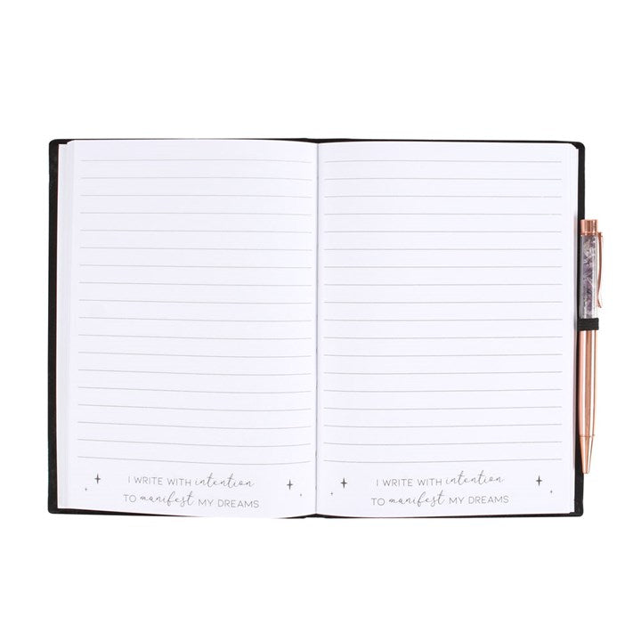 This manifestation journal comes bound in black velvet and makes the perfect place to keep track of hopes, dream and intentions. Features lined pages with 'I write with intention to manifest my dreams' text and comes with an elegant amethyst crystal chip ballpoint pen.